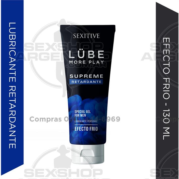 Con el gel lubricante Lube Supreme Retardante lograrás relaciones más prolongadas y placenteras. Acción retardante actúa permitiendo controlar las erecciones retrasando el momento de eyaculación . Con sensual efecto frío. Cont. Neto: 130 ml. Consegui el lubricante intimo Supreme Retardante de Sexitive en todos nuestros Sex-shops.